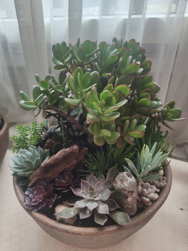 Composición de plantas principalmente crasas en macetero de terracota tamaño L (40 cm aprox)